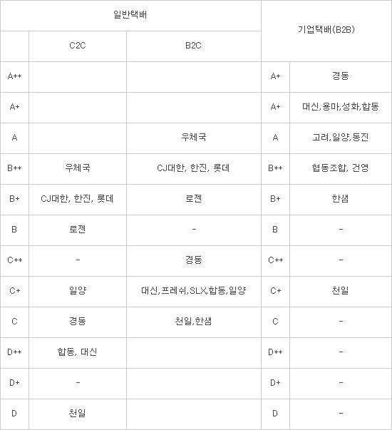 기업택배 분야는 '경동택배'가 최우수, '대신·용마·성화·합동택배'가 다음으로 높은 평가를 받았다.