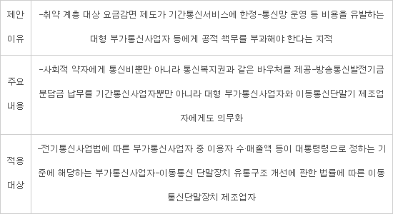 기간통신사업자 의무로 한정된 기존 통신복지 체계에서 나아가 사회적 약자를 위한 통신복지권 바우처 제도 도입과 기간통신사업자·부가통신사업자·단말기제조업자에 통신복지 관련 기금 분담 의무화를 골자로 한 '데이터복지확대 2법'이다.