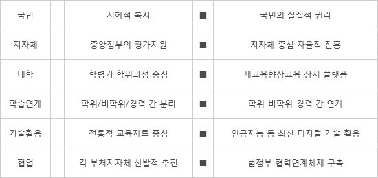 디지털 대전환, 초고령사회 등 시대적 변화에 대비한 '평생학습 대전환'을 정책방향으로 삼았다. 교육부는 시혜적 복지로 인식되던 평생학습을 실질적인 권리로 보장하는 데 주력하는 한편, 지자체·대학 중심의 평생학습 정책을 확대한다.